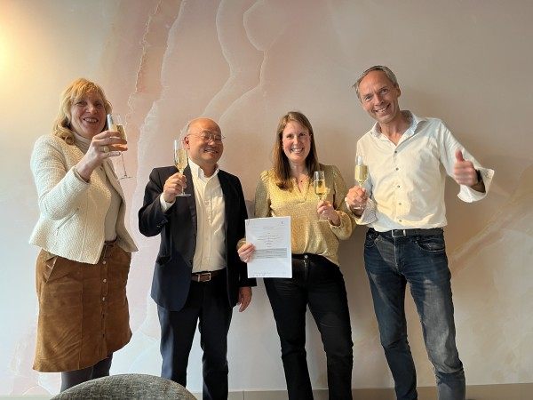 De oprichting van AquaWomb is een feit. Van links naar rechts: Sonja Vos (namens TU/e), Guid Oei, Myrthe van der Ven en Marcel Quist. Foto: AquaWomb